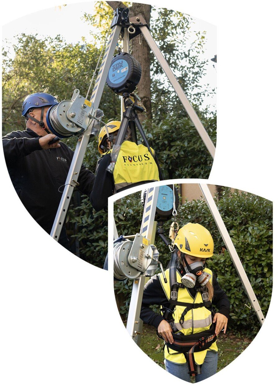 - Esercitazioni pratiche di ingresso in spazi confinati con DPI anticaduta e DPI di protezione della vie respiratorie.